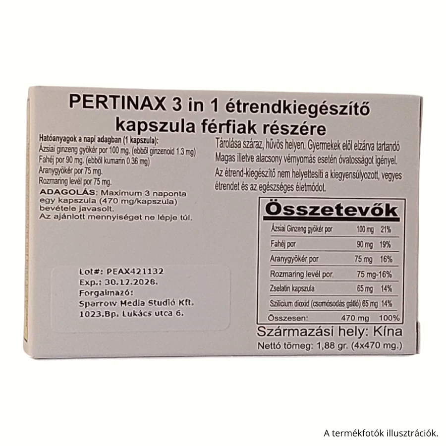 A PERTINAX 3 IN 1 kapszula egy alkalmi potencianövelő étrend-kiegészítő, amely gondosan összeválogatott növényi összetevőket tartalmaz, és hagyományosan a férfi vitalitás és állóképesség támogatásában játszanak szerepet.